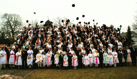 Gruppenfoto mit fliegenden Hüten bei der Jubiläumsfastnacht in Briesen/Brjazyna 2015. (Foto: K. Möbes)
