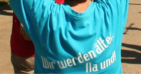 Symbolbild: Aufdruck "Wir werden älter! Na und!" auf einem T-Shirt. (Foto: K. Möbes)