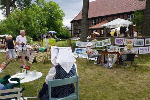 Zum Kunstgartenfest in Dissen gibt es die besondere Möglichkeit, Künstlern der verschiedensten Genres beim Arbeiten über die Schulter zu schauen. Auf unserer Museumswiese zeigen Maler, Fotografen, Textilkünstler aber auch Musiker ihr Können. In einem Pleinair der Schule für niedersorbische Sprache und Kultur, unter der Leitung von Gabriele Gittel, entstehen Aquarelle, Zeichnungen und kleinere Arbeiten. Die Künstler finden Sie unter alten hohen Bäumen hinter der Kirche, im Museumsgarten und in der mittelalterlichen Siedlung "Stary lud". Schauen Sie den Kunstschaffenden bei der Arbeit, ihre Motivwahl und dem Schaffensprozess über die Schulter und kommen sie mit ihnen ins Gespräch. Es werden Schmuck, Aquarelle, Ölbilder, Textilarbeiten und viele andere schöne Dinge zum Kauf angeboten.